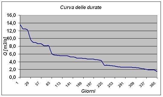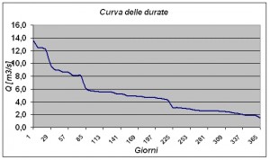 Si può valutare la portata media eseguendo la sommatoria delle portate pesate per le rispettive durate diviso 365 e si ottiene per il caso in esame una portata media pari a 5 mc/s (metri cubi al secondo).