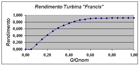 La scelta della turbina avviene in base a vari parametri come il salto geodetico e la portata attraverso l’impiego di opportuni diagrammi, e per il caso sotto esame la scelta ricade su una turbina di tipo Francis caratterizzata dal seguente curva di rendimento: