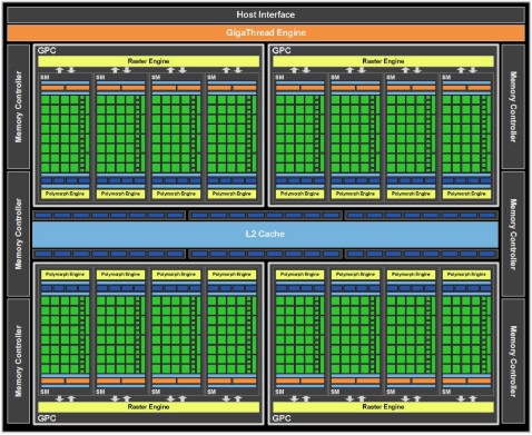Innanzitutto, dalla figura si vede che GF100, nella sua versione top, ovvero con 512 ALU attive, ha 16 Polymorph Engine (PE) e 4 Raster Engine (RE). Questi utlimi permettono di superare il limite imposto dalla presenza di un unico motore di triangle set up che affligge i chip della precedente generazione della società di Santa Clara. In questo modo, il limite del numero di vertici che è possibile inviare in input al motore geometrico sale a 64 (16 per RE), pareggiando il risultato raggiunto da ATi con RV870. I PE sono invece l’interpretazione data da nVidia dell’hardware tessellator. Ma vediamo un po’ più da vicino come è composto un singolo PE