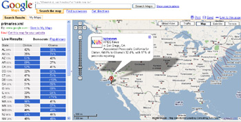 Ma l’appuntamento clou è stato sicuramente quello del Super Tuesday giornata cruciale, ma a quanto pare non decisiva, per le primarie americane. Scende in campo per il live tweeting – neologismo appena coniato – niente di meno che Google, che dimenticandosi di aver da poco acquistato Jaiku, sviluppa un mashup ad hoc con twitter grazie al quale è possibile seguire tutti gli updates che si riferiscono alle elezioni su una mappa.