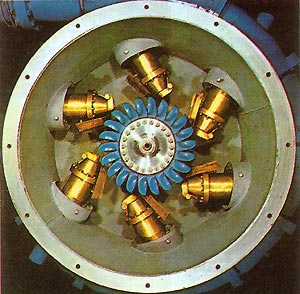 La turbina Pelton è caratterizzate da un elevato rendimento, inoltre è una macchina “parzializzata”, in quanto non tutte le pale ricevono contemporaneamente il flusso essendo presente un numero di ugelli inferiore al numero totale delle pale, come intuibile dallo spaccato di una installazione di tale turbina: