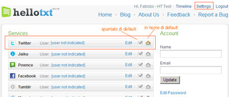 – Dalla pagina Settings e’ possibile effettuare il login a tutti i social network che si desidera gestire tramite Hellotxt, inserendo per ognuno di essi i corrispondenti nome utente e pasword.